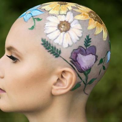 Chauve, en solidarité avec les femmes suivant un traitement contre le cancer.