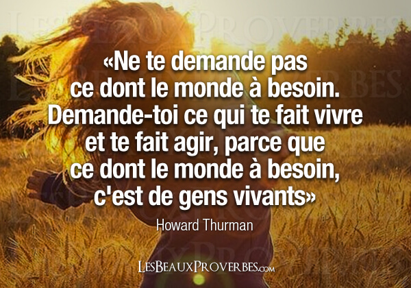 « Ne vous demandez pas ce dont le monde a besoin, demandez-vous ce qui vous fait vivre et vous fait agir, . Parce que ce dont le monde a besoin, c'est des gens vivants »- Howard Thurman